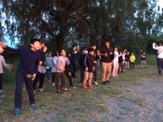 ファイヤーが点火され、ダンス、歌で盛り上がっています。