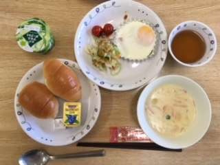 朝食です。パン、クリームシチュー、ハムエッグ、サラダです。いただきます。