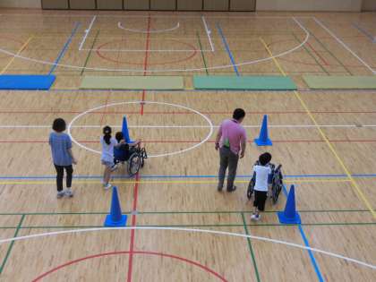2日(月)の2〜4時間目、3年生は車いす体験を行いました。社会福祉協議会の皆様にご来校いただき、車いすの仕組みや乗り方についてお話いただきました。子どもたちは、二人一組になって体験を行いました。S字に曲がったり、マットで段差を作って乗りこえたりしました。車いすに乗る側と押す側との両方を体験しました。押す側の時は、「動かします。」とやさしく声かけをしていました。写真は、1組と3組の様子です。