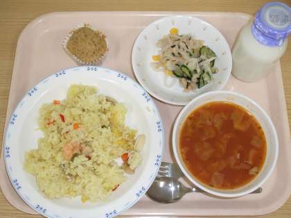 今日は、スペイン料理のパエリアを出しました。黄色いご飯にピーマンや赤ピーマン、にんじんが映え、彩りもよく仕上がりました。魚貝類がたっぷり入った一品に子どもたちも大興奮の様子でした。