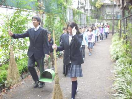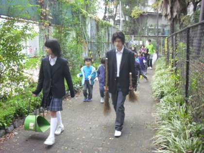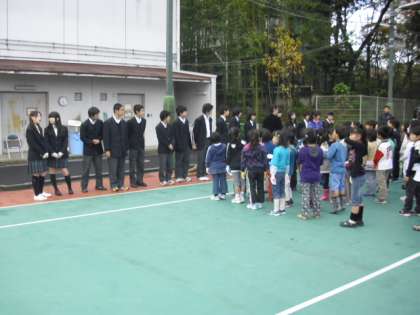 今朝の小中合同落ち葉掃き集会の様子です。中学校は1年生から3年生までの各クラスの整美委員、小学校は2年生と4年生が参加しました。テニスコートで、互いに挨拶した後、中学生からの説明があり、小学校の各クラスに2名ずつ中学生が付き、遊歩道へと出かけていきました。