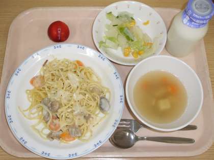 今日のスパゲッティには、えび、いか、ほたてといった「シーフード」をたくさん使っています。濃厚なクリームソースとシーフード特有のかみごたえのある食感が楽しめる一品でした。
