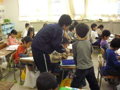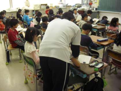 上から1年生の算数の授業の様子です。ノートに問題を書いていいるところです。正しく書けているか見て回ってもらっています。