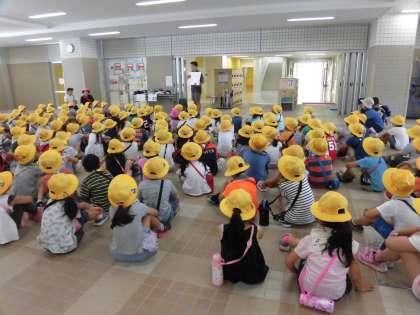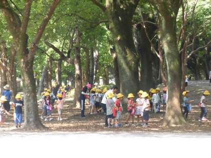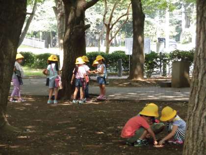14日(土)は土曜授業日でした。朝から気温が上昇する中、1年生は芦花公園へ行きました。生活科の学習で夏探しをしました。出発前に1階ピロティで芦花公園はいく目的と行き帰りの安全について話しを聞きました。歩いて15分程で公園に到着しました。子どもたちは木かげに入った途端、「くらい」「すずしい」と言っていました。イチョウの木を見上げ、黄緑色のぎんなんを見付けたり、セミのぬけがらを宝物のように探したりしていました。暑さに負けず、元気に学校にもどることができました。