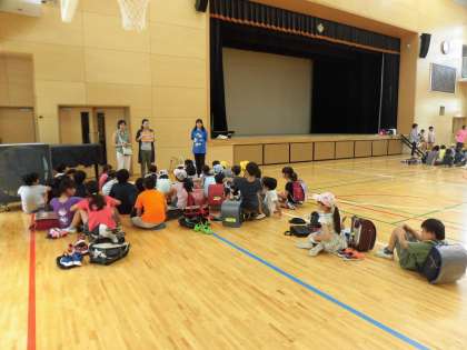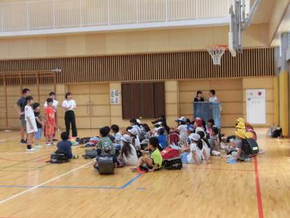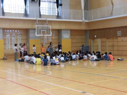 14日(土)の3時間目、地区ごとに集まる「校外班集会」をしました。本校には、22の班があります。6年生が1年生を迎えに来てくれ、2年生以上は自分たちで班の集合場所に移動しました。20名以下の班があれば、70名近い班もあります。人数の確認、校外委員の保護者の紹介、班長等の選出などをしてから、集団下校を始めました。暑い中、集会と下校のためにご協力いただきました保護者の皆様に感謝いたします。写真は、体育館で行われた粕谷班の様子です。