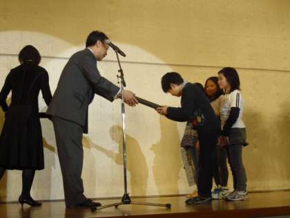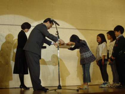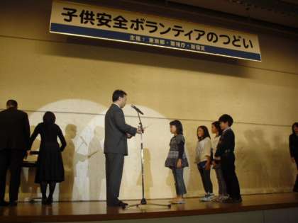 本日、東京都庁第一庁舎5階の大会議場で行われた「地域安全マップコンクール表賞式」の様子です。優秀賞3校、デザイン賞3校のうち、芦花小学校3年生の3作品がデザイン賞を受賞しました。警視庁の方から、賞状と記念品等が代表の児童に受与されました。芦花小の代表として、立派にその役目を果たしました。