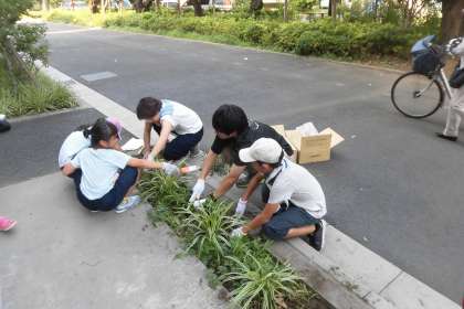 先週に引き続き今週の水曜日の16時から、グリーンボランティアが行われました。この2回の活動では、校地の周りにある花壇に生えた伸び放題の夏草を、取り除くことが目標となりました。夕方の若干涼しくなり始めた植栽の辺りを、有志の子どもたち、保護者の方や地域の方々、教職員が一丸となって清掃にあたると、都合2時間の活動で見違えるほどきれいになりました。これで、気持ちよく夏休みが迎えられそうです。参加してくださった皆さん、本当にありがとうございました。