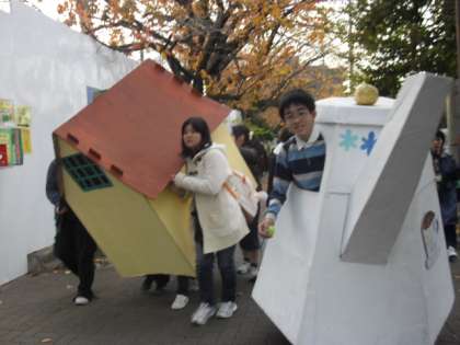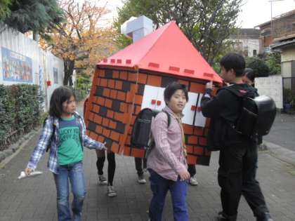 6年生が作成した共同作品「段ボールバンガロー」を八幡山保育園に運んでいる様子です。展覧会の初日に、八幡山保育園の先生3名と園児8名が参観に来てくれました。その時、バンガローで楽しく遊ぶ様子を見て、「展覧会終了後に、遊具として使いませんか」と声をかけたところ、喜んで受け入れてくれたのです。運んでいる3つのバンガローは、そのときの園児が選んだ3作品です。