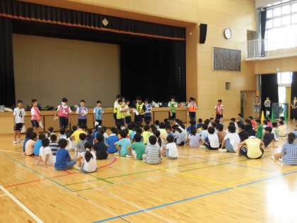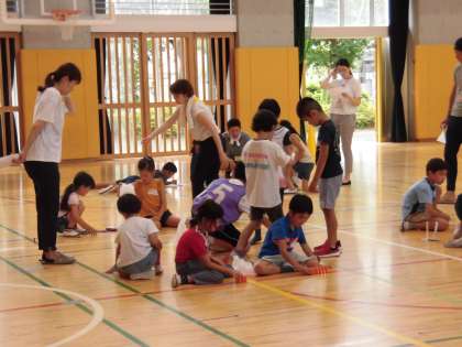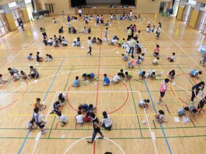 24日(火)、サマーワークショップの一つ「ドミノたおし」が始まりました。小学生の取り組みのために、中学1年生(ビブス着用)、中学2年生、3年生、高校生、そして保護者の皆様のご協力をいただいています。約束ごとの確認をして、熱中症に気を付けながら、午前9時10分にグループごとに作業を開始しました。正午にたおす予定で取り組んでいます。