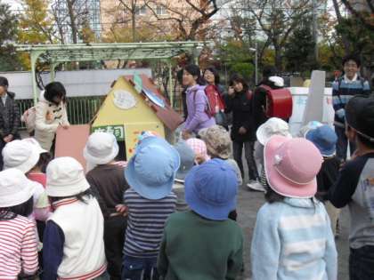 八幡山保育園に到着し、園庭で園児を前に段ボールバンガローを紹介しているところです。園児たちも、自分たちが選んだバンガローが本当にやってきたので大喜びでした。6年生も園児たちの喜ぶ顔を見てうれしそうです。自分たちの作った作品が、地域に生かされたことは、6年生にとっても新しいふれあいとなりました。