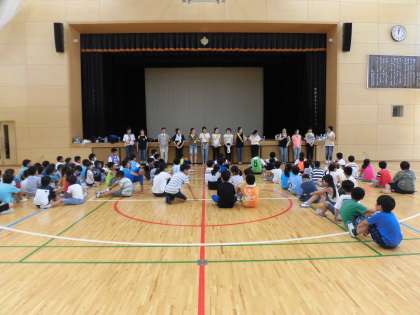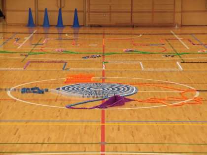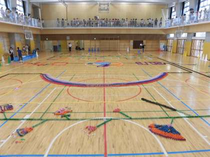 約2時間半かけてドミノが完成しました。子どもたちは体育館2階ギャラリーに移動しました。午前11時45分に校長先生の指が動き、ドミノがたおれ始めました。ヘビの道、草花、にじ、うず巻きなど子どもたちの並べたドミノが次々にきれいにたおれていくと、会場にいるみんなから歓声が挙がりました。ゴールまでの所要時間は10分弱。最後は、みんなでドミノを色別に片付けました。協力したからこその素晴らしい取り組みとなりました。中心となって活動してくださった保護者の皆さんに子どもたちから「ありがとうございました。」のお礼のあいさつをして終わりました。