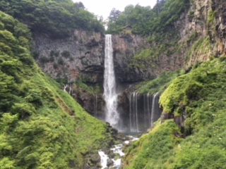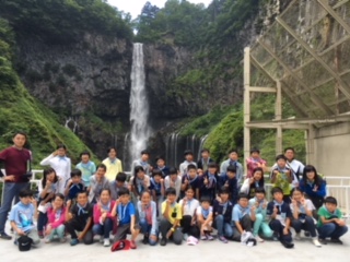 華厳の滝を見学しました。滝壺脇の斜面にカモシカの姿が見えます。クラスごとに記念撮影です。