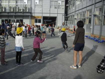今朝のフレンドワールドの様子です。異学年交流の縦割り遊びの時間です。校庭は、1年生と6年生の割り当てです。すっかり定着した長なわ跳び。1年生がとても上手になっていることに驚きます。6年生の教え方がよいのでしょう。ほほえましい光景です。
