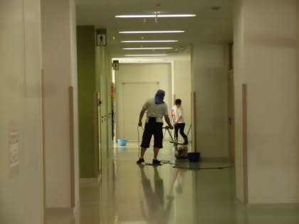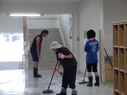 25日(水)から主事さんたちがろう下や階段、トイレ床面のワックスかけをしています。27日までは、校舎東側の植物階段を行いました。機械を操作しながら床面をぴかぴかに磨きあげています。8月からは動物階段、各階のろう下のワックスかけをします。写真は、27日(金)の作業の様子です。