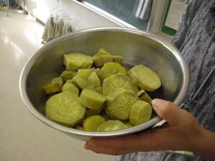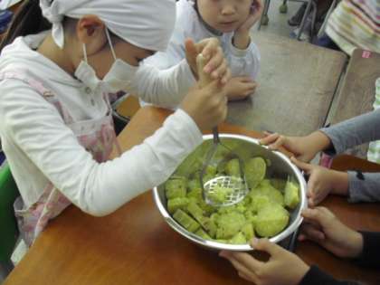 2年生の生活科の授業の様子です。先月の26日に近隣の畑で収穫すたさつまいもを使っての茶巾しぼり体験をしているところです。保護者の方々も多数協力してくださいました。保護者の方が家庭科室で蒸してくれたさつまいもを生活班で協力してペースト状にすりつぶしている最中です。