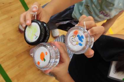 ヨーヨーの側面の絵を描いて本体にパチッとはめ込むと、オリジナルヨーヨーの完成です。ヨーヨーを指に装着する仕方、紐の巻き方、持ち方、遊び方のレッスンを受け、あとはどんどんチャレンジするのみ。「あっ、できた!」「うまくいかないなぁ」。基本の30の技は、頑張れば1年で習得できるとのことです。