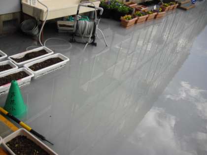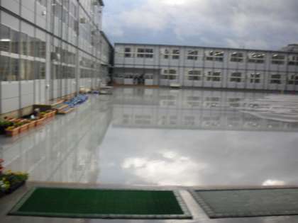 今朝の校庭の様子です。ご覧の通り、プール状態で第2昇降口へ行くことができない状態です。この写真を撮影したときは、登校も一段落し、青空も顔をのぞかせていました。