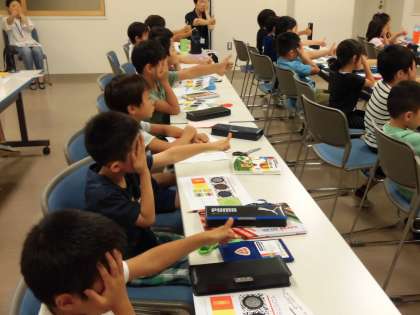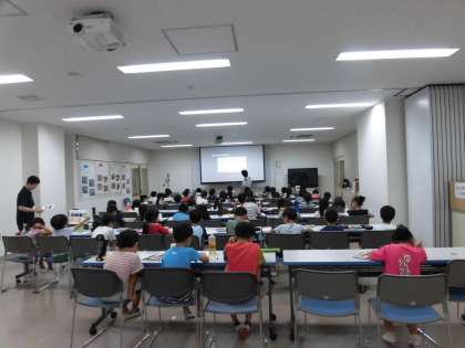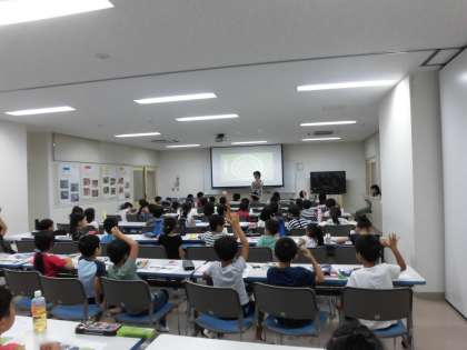6日(月)の午後1時からサマーワークショップの「科学教室『ルークの冒険3』」を会議室で行いました。この時間は1年生対象でした。「イロのふしぎ」と題して様々な模様の見え方を学びました。子どもたちからは大きな歓声があがりました。