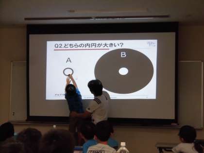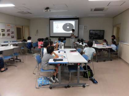 6日(月)の午後3時からサマーワークショップの「科学教室『ルークの冒険4』」を会議室で行いました。この講座は昨年度受講した2年生が対象です。「すわって悩むなら、動いて考えよう」を合い言葉に子どもたちは自分の考えを発表していました。