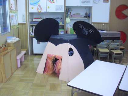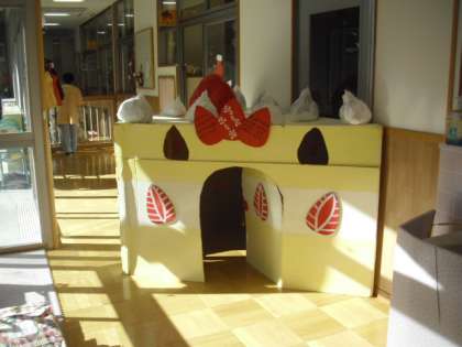 昨日、6年生の手で芦花保育園に寄贈した段ボールバンガローですが、ドアより大きなバンガローがどのようになっているのかが気になって保育園を訪ねてみました。すると、3作品とも施設の教室や廊下に配置されていました。そして「げつようびに、みんなであそびます。それまでさわらないでね!おやくそくです。」とひらがなで表示が貼ってありました。保育園の子どもたちがバンガローで遊んでいる様子を、ぜひ、見てみたいですね。