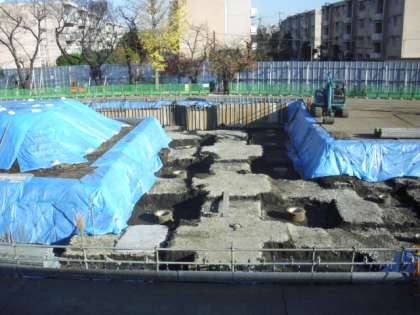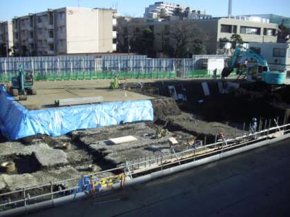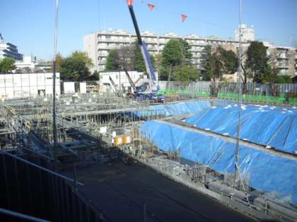 5年生の教室の前の廊下の窓から見た東側の工事の様子です。11月24日の写真と比べると足場がしっかりと組まれています。また、ショベルカーでの掘り起こしが、第2ゲートの方まで進んでいます。