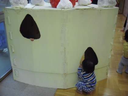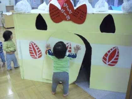 芦花保育園に届けた段ボールバンガローで、園児たちが遊んでいる様子です。1歳児の子どもたちが、遊んでいるところです。ケーキのバンガローは、0歳児〜1歳児の部屋の廊下に置いてあります。中に入って窓から顔を出したり、ドアから出入りを繰り返したりして遊んでいました。外れたドアを一生懸命直そうとする園児もいました。6年生にも見せてあげたい光景です。