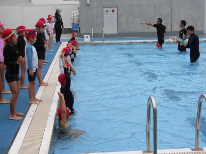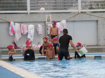 29日(水)の水泳指導第3部は2年生でした。検定とあって81名が参加しました。けのびやバタ足の練習をしてから検定に臨みました。コースごとに分かれるときは静かに移動することができました。