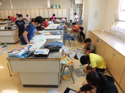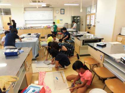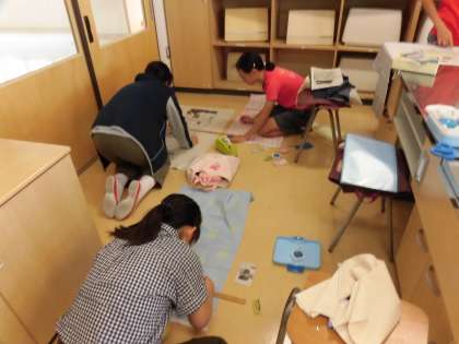 5日(水)の3・4時間目、6年4組は家庭科の学習をしていました。「生活に役立つ物作り」という単元です。1学期中に作った型紙を自宅から持ってきた布にあて、裁断するところまで取り組みました。布を床に広げてその上に型紙を置き、チャコペンでぬいしろの印をつけていきました。6年生はこれまでクッション作り、エプロン作りをしているので、ぬいしろの取り方がとても上手にできていました。