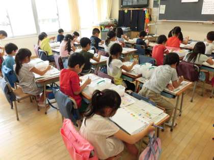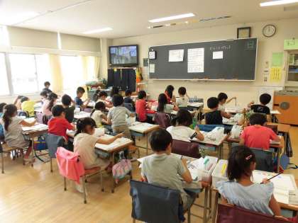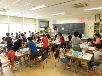 6日(木)の3・4時間目、1年3組と4組は図画工作の時間でした。初めての絵の具に取り組みました。パレットに色を出し、絵筆に色を乗せて画用紙に向かいました。きれいな色に喜びの声が聞かれました。片付けの際、水をこぼさないようにゆっくり水入れを運ぶ姿がありました。