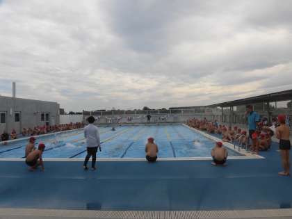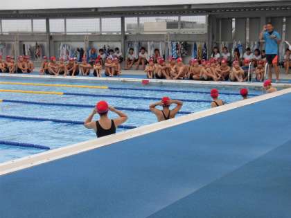 6日(木)の5・6時間目、6年生の水泳指導がありました。来週行われる「水泳記録会」を想定して練習を行いました。コースロープを取り付け、エントリーした種目ごとに泳ぎました。一人ずつ呼名されると、手を挙げたり両手をふったりする姿がありました。「男女関係なく友達を応援するレベルをもっと上げよう。」と先生から声がかかりました。