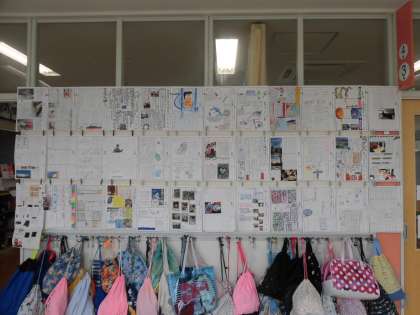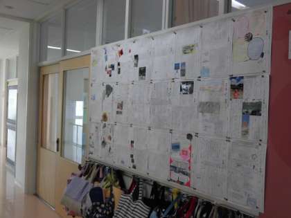 4年生のろう下の壁面には、「夏休み新聞」が掲示してあります。夏休みの思い出を記事にしています。絵や図を入れたり、写真を粘ったりしてよりわかりやすく書かれています。