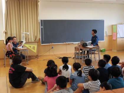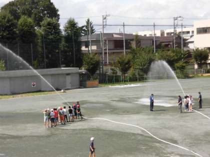 3年生の訓練は「通報連絡訓練」でした。消防署の方にお話をしていただき、1日に2500件もの通報があると知り子どもたちは驚いていました。教室に設置された電話を使って消防署に連絡をし、署員の方と通報のやりとりをしました。4年生は校庭でDポンプの訓練を行いました。勢いよく出てくる水を操作するために子どもたち同士でホースを支えながら放水しました。