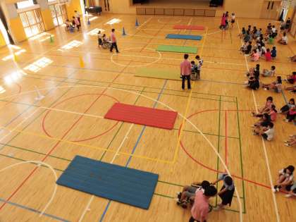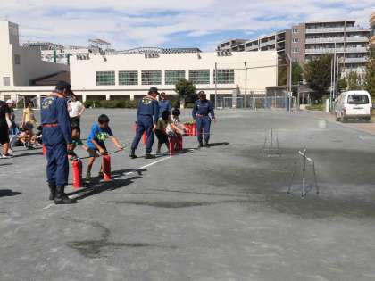 5年生は校庭で「初期消火訓練」を行いました。水の入った消火器を一人ずつ操作して目標に向かって水を放ちました。操作の前には「火事だ」と大きな声を出していました。6年生は、体育館で車いす体験をしました。車いすに乗る人、おす人になり、体育館の横を往復しました。今回の防災訓練は、区役所、烏山総合支所、消防署、粕谷会、消防団、芦花ホームの皆様のご協力をいただきました。大変お世話になりありがとうございました。