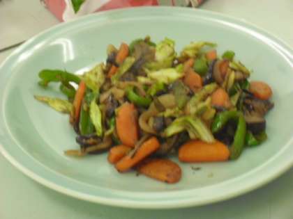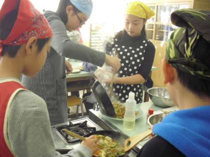 5年生の家庭科の授業の様子です。調理実習で野菜炒めを作りました。家庭科室から野菜を炒めるいい香りがしてきます。グループごとに考えた食材を使って協力して作りました。どのグループも自分たちで作った野菜炒めをおいしそうに食べていました。