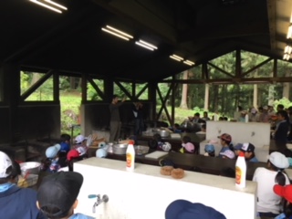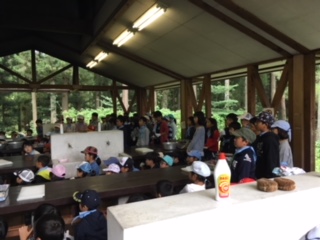 飯盒炊さんが始まります。補助員の藤沢さんに手順を説明していただいています。出来上がりが楽しみです。