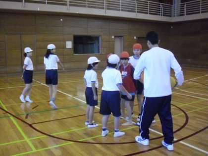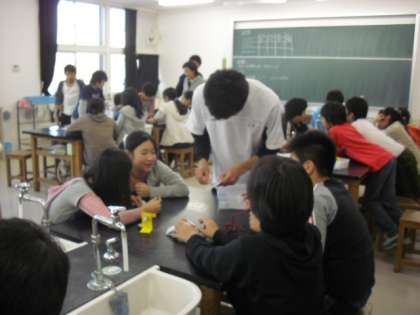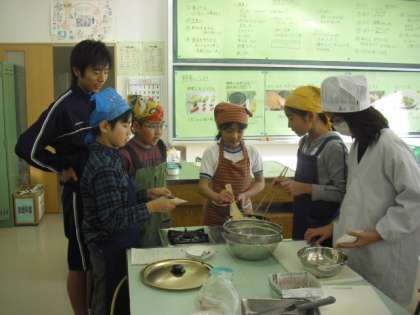 上から4年生の体育の授業です。生徒さんがボールゲームの進行をしています。パスのアドバイスもしていました。次は、5年生の家庭科の授業です。調理実習で野菜いためを作っているところです。安全面を中心に補助をしています。そして、6年生の理科の授業です。各グループで行う実験の補助をしています。