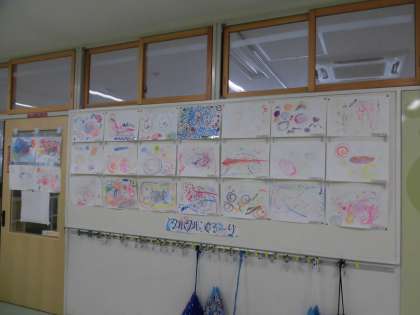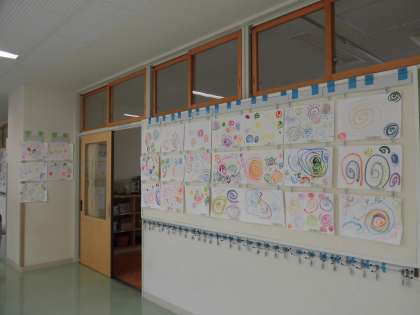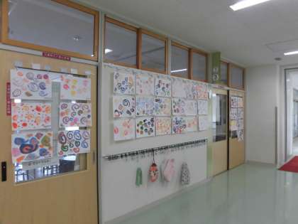 1年生のろう下には、図画工作の時間に絵の具で描いた作品が掲示されています。題して「クルクルぐるーり」です。絵筆の先を上手に動かしながら、いくつものクルクルを作っていました。色使いもすてきです。