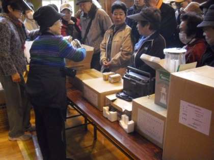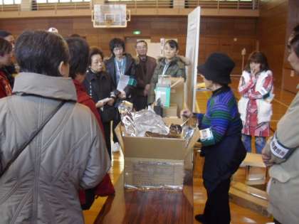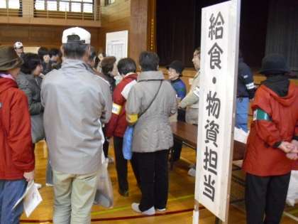 給食・物資担当の様子です。防災倉庫にある物品の確認、配布の準備等の役割があります。防災倉庫にある物品の一部を紹介しているところです。非常食のアルファ米の試食も行いました。