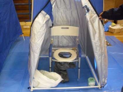 救護・衛生担当の様子です。簡易トイレの設置が大きな仕事です。簡易トイレは実際に担当者が組み立てました。避難者が共同で使うので使い方や清掃について徹底する必要があることを説明しているところです。
