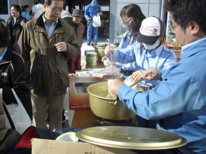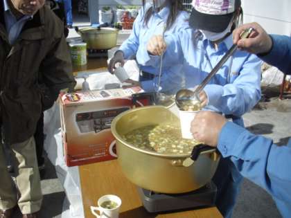 災害時に支給される非常食の炊き出しも行われました。今回は豚汁です。参加者に配られました。体が温まりました。訓練に参加いただいた方々、ありがとうございました。