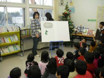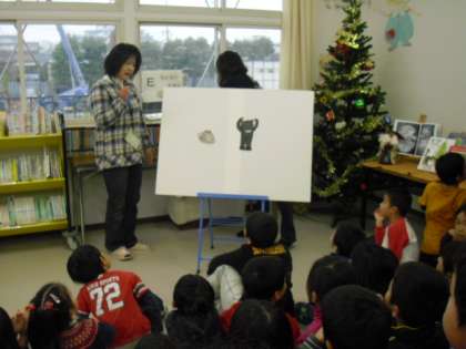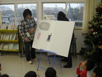 中休みに図書室で行った、保護者のボランティアによる読み聞かせの様子です。広いパネルに絵や人形等を置きながらお話をするパネルシアターを行っているところです。しりとりなどもあり、子どもたちも参加し、盛り上がりました。特に低学年の子どもたちが楽しんでいました。