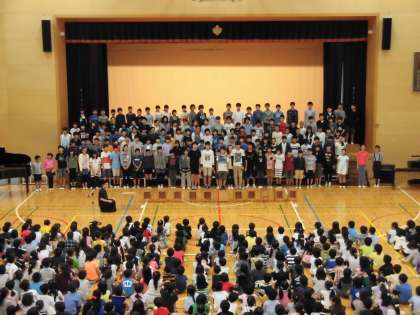 21日(金)の朝、体育館で音楽朝会をしました。6月に引き続き6年生がひな段に登場し、「星空はいつも」の歌を披露しました。最初に、4人の男子が全校児童の前で音楽朝会にかける意気ごみを話しました。次に、ひな段上に4名が立ち上がって歌詞を大きな声で読み上げました。