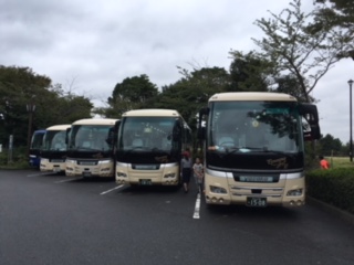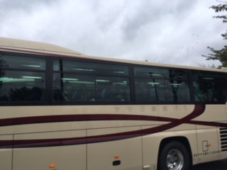 昼食場所の潮風公園です。雨は止んでいますが、下が濡れているため、バスの中でお昼をとっています。