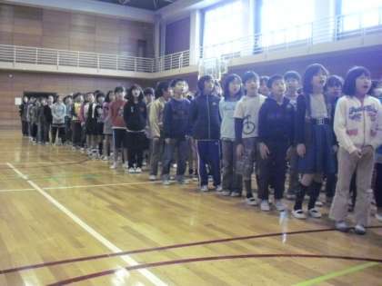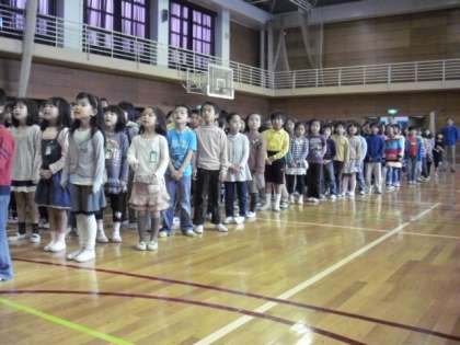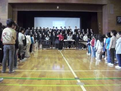 舞台には中学生が立ち、舞台のスクリーンには歌詞が映しだされています。子どもたちは舞台の方を見つめながら歌っています。