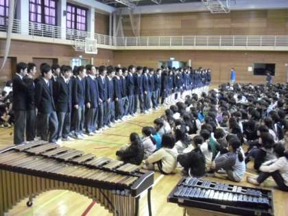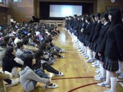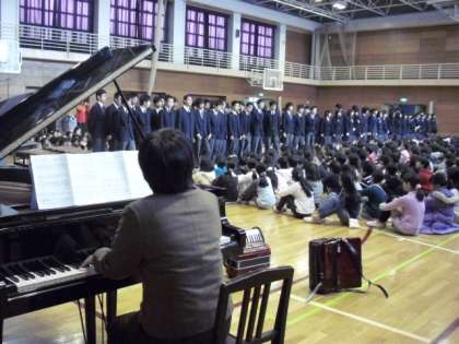 1年生から3年生、4年生から6年生とパートを分けて2部合唱としています。今度は中学生が舞台から移動し、小学生の前に立ち、お手本としてパートの違いを聴かせてくれているところです。