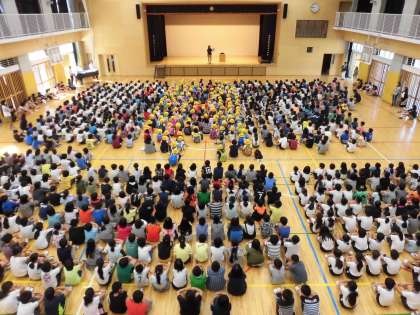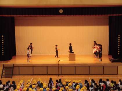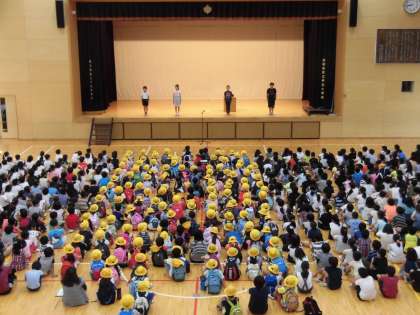 あいさつキャンペーン10月の担当は、4年生です。ステージで5年生の代表と引きつぎをしました。その後、4年生があいさつキャンペーンの抱負を述べました。全校朝会の最後に、生活指導担当の先生から「自転車に乗るときはヘルメットをかぶりましょう。」という話をしました。かぶることの良い点2つを子どもたちもよく聞いていました。