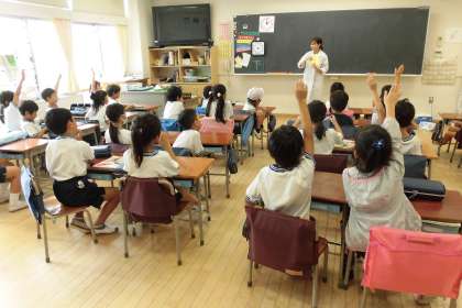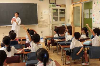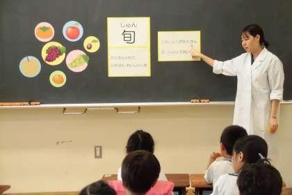 9日から12日にかけて、給食前の5分間を使い、栄養士が食育の指導を行っています。対象は1年生。今回のテーマは「秋が旬の果物を知る」です。5組の様子を覗いてみると、「柿」「巨峰」「プルーン」と、給食によく出されるものを中心に、どんなものがあるかを学級で出し合っていました。「秋は果物がたくさんとれて一番美味しい時期。みんな味わって、美味しく食べようね。」と栄養士が語りかけると、子どもたちは「はぁい!・・・ところで今日は何が出るの?」と、興味津々に目を輝かせていました。
