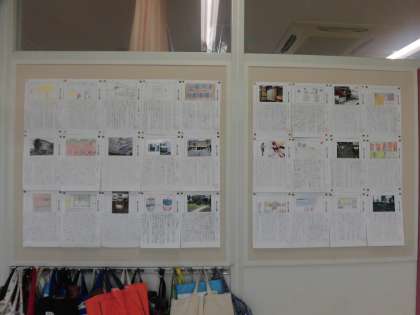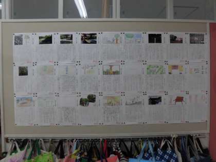4年生のろう下には、国語の時間にまとめた「お気に入りの場所」を掲示しています。用紙は上下2段に分かれています。上段にはお気に入りの場所を絵か写真で示し、下段には場所を紹介する文章を書いています。なぜお気に入りなのか、読み進めるとわかります。