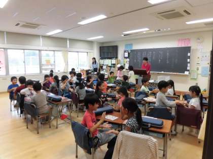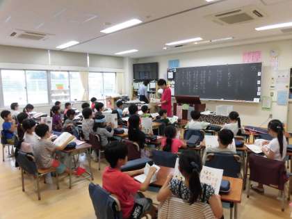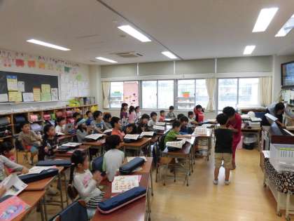 11日(木)の3時間目、1年3組は音楽の時間でした。手遊びをしながら歌うことを目的として「おちゃらか ほい」の歌を練習しました。歌の途中で相手とじゃんけんをし、勝ったら喜び負けたら残念がる動作も楽しみながらできました。