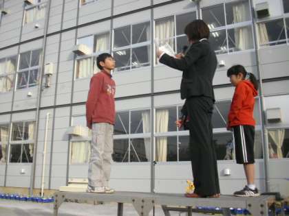 続いて、小学生書道展で、優秀賞と佳作を受賞した児童を紹介しました。高学年らしくよい姿勢で渡部校長から賞状を受け取りました。